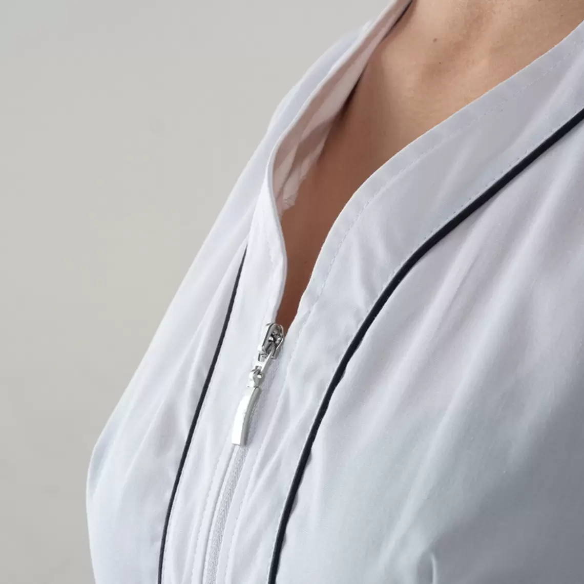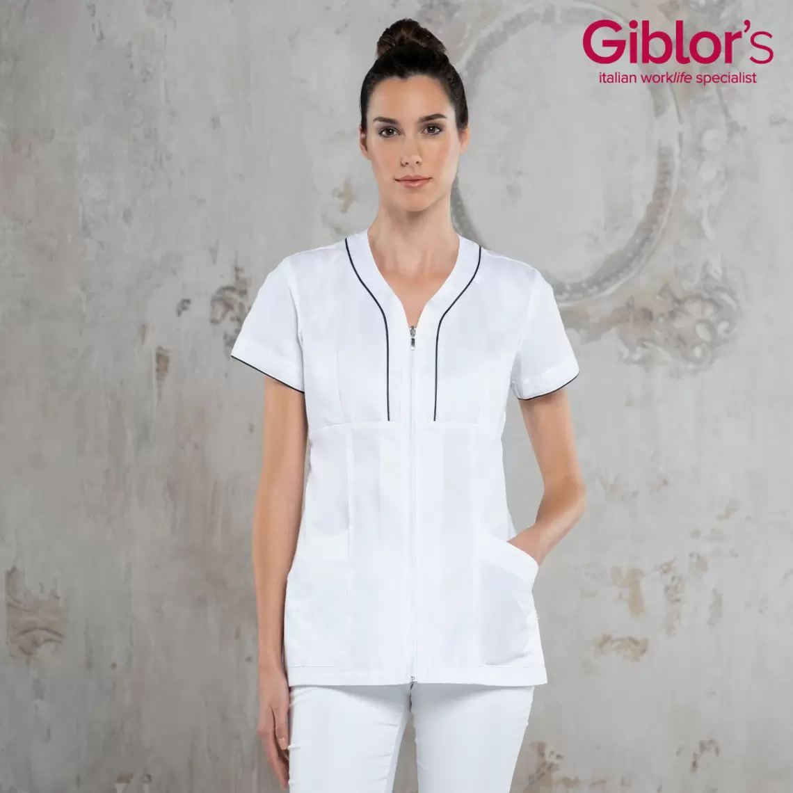 Tunica medicala dama Pines Giblor’s, confectionata din polibumbac moale, 65% poliester si 35% bumbac, greutate material 143 g/m², un material cu o durabilitate excelenta.
